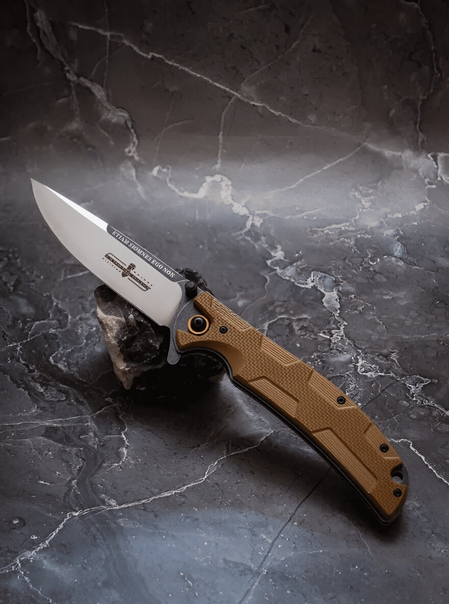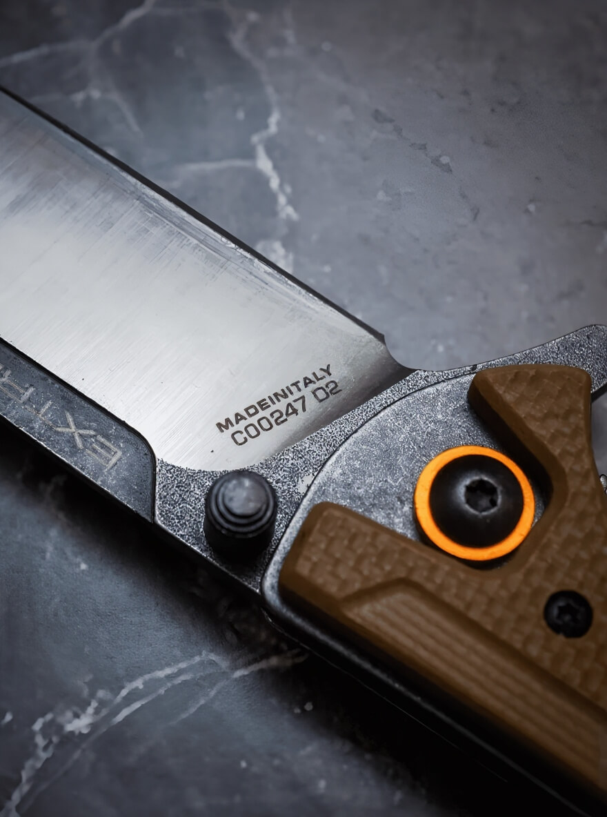 Представляем вашему вниманию нож от известного бренда Extrema Ratio, который выделяется великолепной механикой, внушительными размерами и отличными рабочими характеристиками. Клинок этого складного ножа изготовлен из высокоуглеродистой стали D2, которая завоевала признание среди любителей ножей благодаря своей надежности и выдающимся режущим качествам. Твердость стали составляет 58-60 HRC по шкале Роквелла, что обеспечивает долговечность и стойкость к износу.