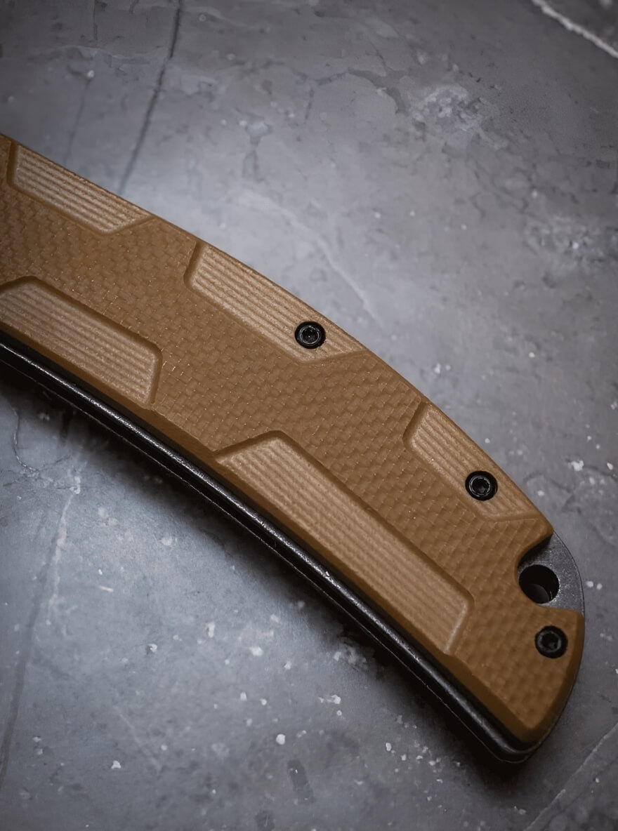 Рукоять ножа выполнена из стеклотекстолита G-10 — многослойного композита, состоящего из стекловолокна, пропитанного эпоксидными смолами. Этот материал, обработанный под воздействием тепла и давления, обретает высокую прочность и устойчивость к механическим повреждениям, что делает его идеальным выбором для создания надежного инструмента.