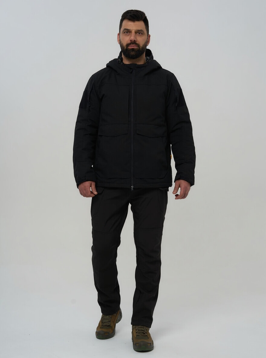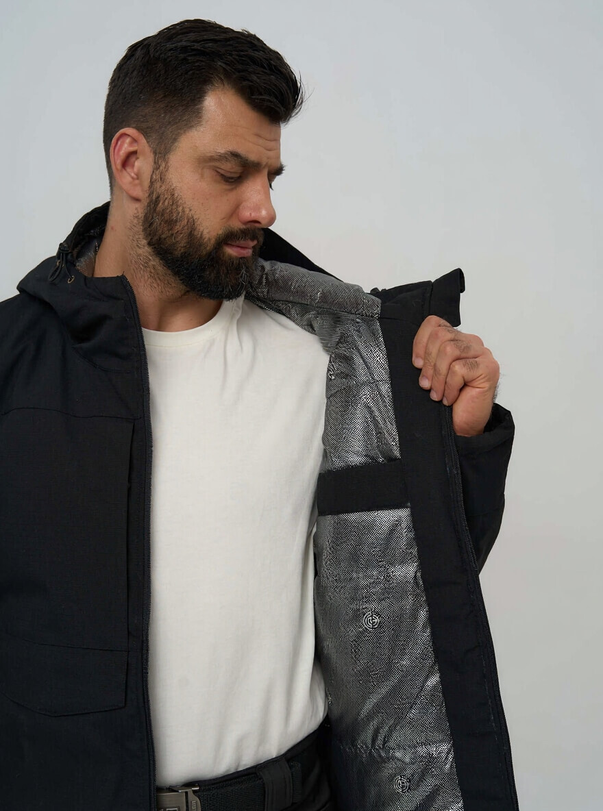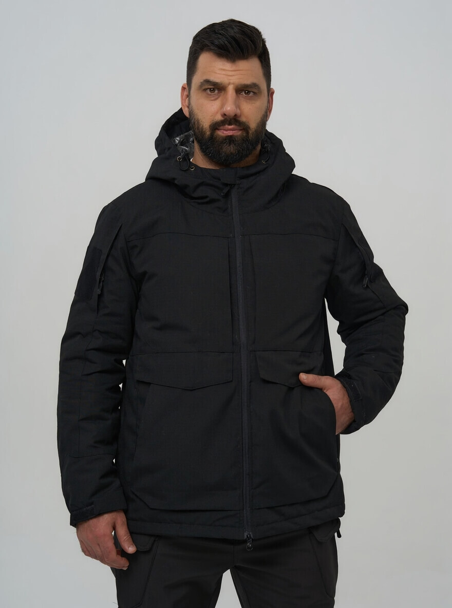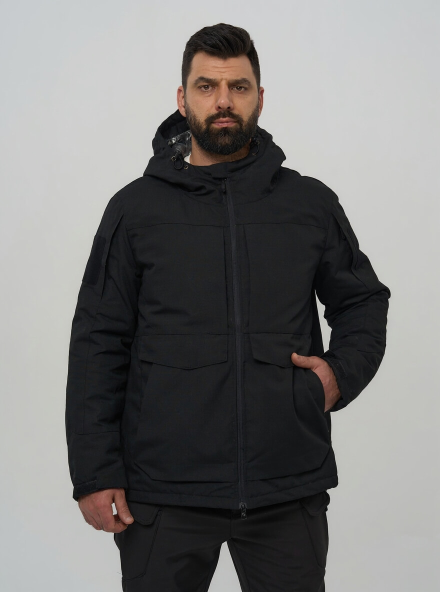 Для тех, кто ценит скрытность и универсальность. Эта куртка в строгом черном цвете сочетает в себе технологичную защиту от экстремальных холодов и тактическую функциональность, оставаясь при этом незаметной в любой обстановке — от городских улиц до профессиональных задач.