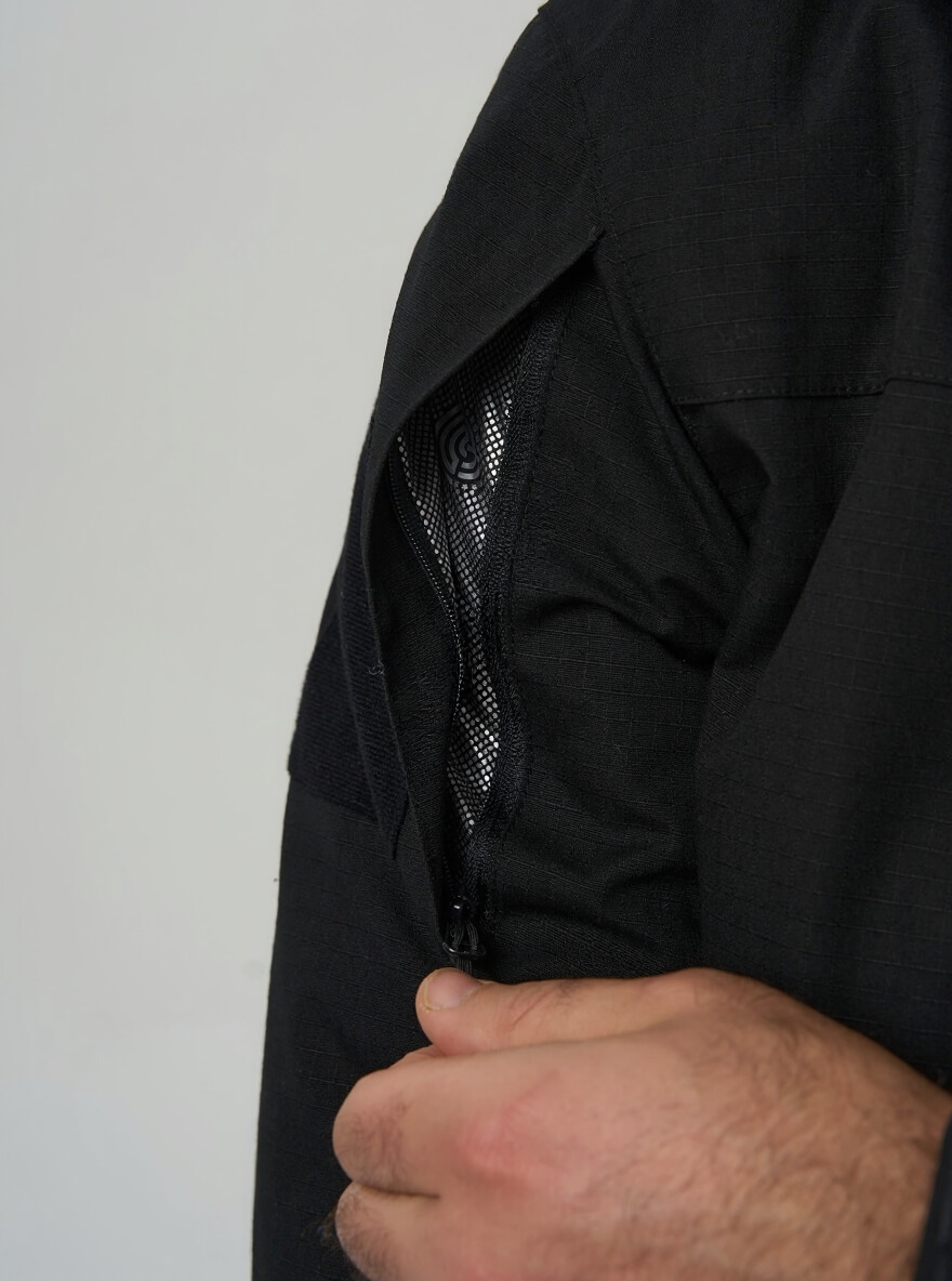 - Защита от стихии: внешняя ткань рип-стоп (65% полиэстер / 35% хлопок) обладает водо- и ветрозащитными свойствами.