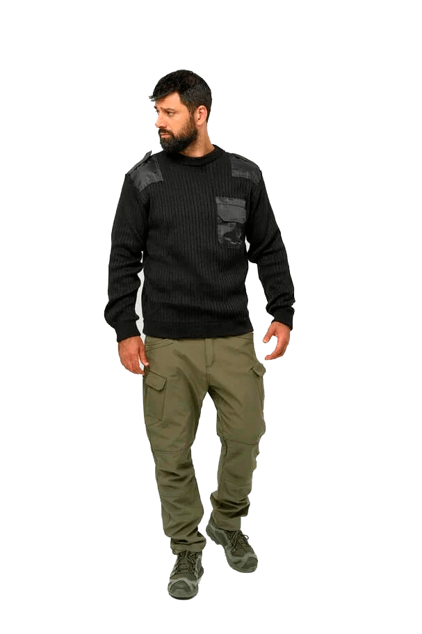 Ваш универсальный элемент стиля милитари для прохладного сезона. Черный цвет и строгий дизайн делают этот джемпер уместным как для службы, так и для города.