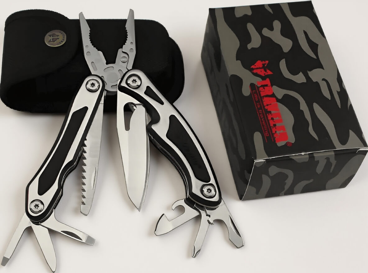 Туристический армейский мультитул-нож 9в1 «Traveler» – идеальное решение для активного отдыха и военных нужд! Этот многофункциональный инструмент включает пилу, консервный нож, открывалку для бутылок, пассатижи, нож для хозяйственных работ, среднюю плоскую и крестовую отвертки. Он универсален благодаря своей прочности и черной расцветке, подходит как для туризма, охоты, рыбалки, так и для повседневного использования и тренировок.